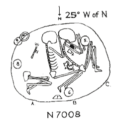 | 7008 | A | Adult | Female | A. Lythgoe | Flexed, left side | Upper body | Not present. | Type I | In situ | None found | In situ | All three burials appear contemporary. | |