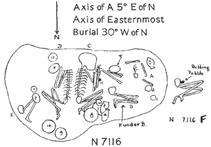 | 7116.1 | F | Adult | Female | A. Lythgoe | Flexed, left side | Upper body | Not present. | Type I | None found | None found | In situ | Under burial B. Carnelian bead. | |