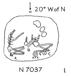 | 7037 | A | Adult | Male | A. Lythgoe | Flexed, left side | Upper body | Type II | Type I | In situ | None found | In situ | About 8 cm above burials B & C. Sex not positive. | |